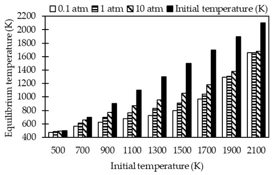 Figure 9 presents the thermal behavior of the methane cracking process. For the simulations, the amount of methane was fixed at 1 mol of the process feed. The equilibrium temperature profile followed the expected, since it is an endothermic process; so, the equilibrium temperatures were lower than the initial temperatures for all the conditions verified. It was noted that pressure increases reduced the endothermic behavior of the process; however, increases in the initial temperature minimized the effect of pressure on the thermal behavior of the process. Pressure increases reduced the methane conversion rates; thus, the endothermic effect tended to be reduced and this justifies the results presented in Figure 9.