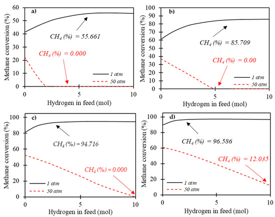 Figure 12 presents the behavior of the methane conversion as a function of the addition of hydrogen to the feed stream, together with the methane for fixed conditions of temperature and pressure. The simulations were performed using the entropy maximization methodology with 1 mol of methane in the feed. As verified in this text, pressure increases reduced the methane conversion rates, and this result is presented again in Figure 12 where the process is verified operating at 1 and 50 atm under similar operating conditions, showing the higher conversion rates of methane operating at low pressures. Note that when the system is conditioned at 1000 K, the addition of hydrogen in the feed tends to reduce the methane conversion; however, for the results verified at 1500, 1600, and 1700 K, the behavior becomes inverse, where methane conversion increases with the decreasing CH4/H2 ratio. The objective of this verification was to obtain optimal operating conditions so that it was possible to obtain good methane conversion rates with extreme pressure variations.