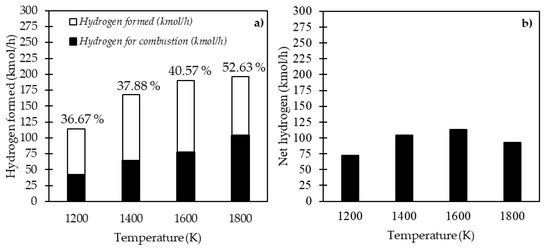 The results presented were obtained by characterizing the system for processing 100 kmol/h of methane, and the CH4/H2 ratios in the feed were obtained from the results presented in Figure 12. Conditioning the system at 1200 K, the CH4/H2 ratio in the feed was 1:6. The temperatures of 1400 K, 1600 K, and 1800 K were equal to 1:6, 1:10, and 1:10, respectively.