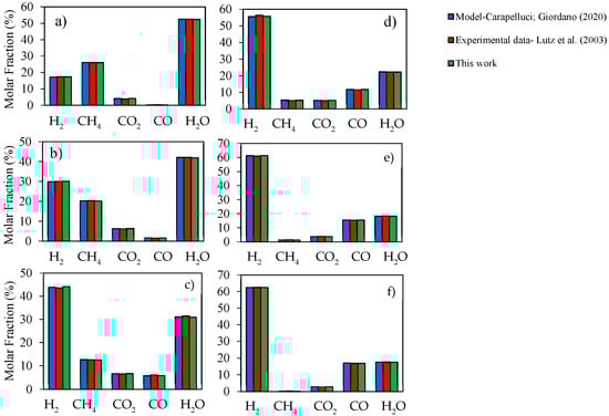 Results obtained from the Gibbs energy minimization model used in this work and the data simulated by Carapellucci and Giordano [22] and experimental data from Lutz et al. [23]: (a): 773 K; (b): 873 K; (c): 973 K; (d): 1073 K; (e): 1173 K; (f): 1273 K.