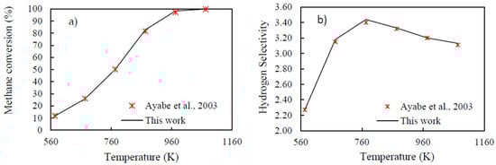 Comparison of the results of the Gibbs thermodynamic energy minimization model and the experimental data of Ayabe et al. [20]: (a) methane conversion; (b) hydrogen selectivity.