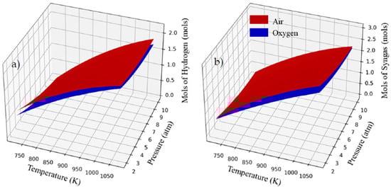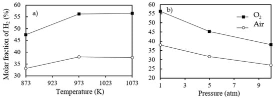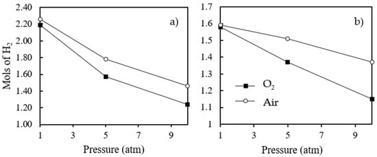 The negative effect of temperature that begins to be evident with the increase of oxygen in the system can be changed with the increase of pressure; however, this would decrease the number of moles formed of hydrogen and synthesis gas. On average, the production of these compounds was reduced by 19.7% using O2 and 14.0% using air, by intensifying the pressure in the different investigated conditions. The increase in hydrogen production with the use of air as an oxidizing agent in relation to the use of pure oxygen became more noticeable as the pressure was increased, demonstrating a behavior of the system using air less susceptible to a drop in hydrogen production due to the pressure increase. The trend is shown in Figure 5.