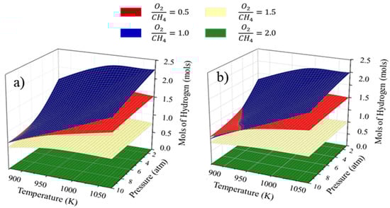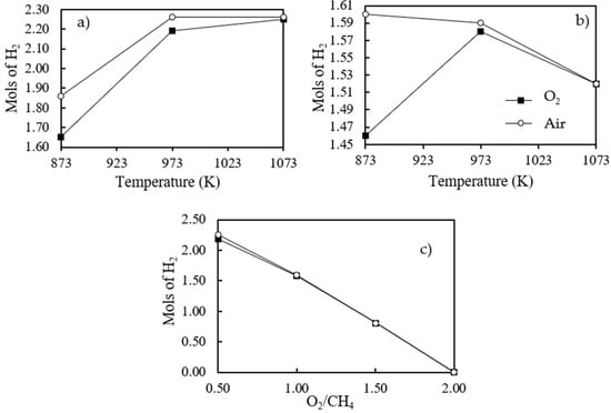 Thus, the reaction using air would be advantageous in terms of moles of H2 produced over the use of pure oxygen at low temperatures and moderate or high pressures for isothermal systems. Although for the reaction, the best conditions are found at high temperatures, low pressures and low O2/CH4 ratios, a region in which there is not much difference between the oxidizer used.