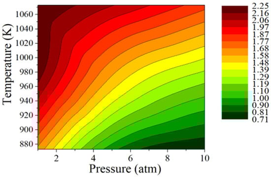 Figure 9 shows the final system temperature for different inlet temperatures, pressures and O2/CH4 ratios in the system feed stream. The reduction of the final temperature when using atmospheric air in relation to pure oxygen is remarkable due to the fact that part of the energy used to heat the system is added to the inert gas flow [25], an effect also observed by Freitas and Guirardello [15]. In summary, there was on average, a 5% temperature reduction using air compared to the introduction of pure oxygen, which is favorable to avoid hot spots in the reactor. Furthermore, the increase in the outlet temperature of the gaseous stream is noticeable with the addition of oxygen in relation to methane in the system, as shown in Figure 10, which was already expected due to the concomitant predominance of exothermic reactions.