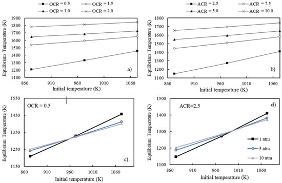 Variation of equilibrium temperature at different reaction conditions: (a) as a function of initial temperature for fixed values of OCR = 0.5–2; (b) as a function of initial temperature for fixed values of OCR = 2.5–10; (c) as a function of initial temperature for PCR = 0.5 for fixed pressure; (d) as a function of initial temperature for PCR = 2.5 for fixed pressure.