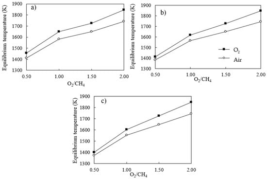 Equilibrium temperatures of autothermal reforming of methane systems using O2 (a) and air (b) as oxidizing agent.