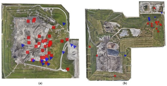 Locations of major methane emission sources as predicted with SEM2Flux (red squares using D-SEM data, blue triangles using G-SEM data): (a) Landfill B; (b) Landfill C.