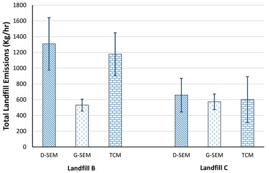 As described in the Methods section, tracer correlation method (TCM) testing was performed during the same week as the D-SEM and G-SEM data collection campaigns. The tracer correlation method is considered the most reliable technique for estimating emission rates in landfills and is often used to provide ground truth data for other technologies or techniques. Table 4 shows the summary of the TCM estimates of fugitive methane emissions from both of the landfills during the monitoring period. Twenty estimates of methane emissions were obtained in Landfill B over the monitoring campaign. The average TCM-measured methane emissions for Landfill B was 1178 Kg/h, with a standard deviation of 271 Kg/h. In Landfill C, 16 measurements of methane emissions were obtained during the monitoring period. The average TCM-measured emission rate for Landfill C was 601 Kg/h, with a standard deviation of 292 Kg/h. Figure 4 shows the TCM-reported emissions plotted with emission estimates as predicted with SEM2Flux using the G-SEM and D-SEM data. For both landfills, the D-SEM data yielded statistically similar estimates of methane emissions as the TCM-measured emissions. On the other hand, the G-SEM data yielded comparable estimates of emissions to TCM-measured emissions only for Landfill C, where the D-SEM and G-SEM data were statistically not different.