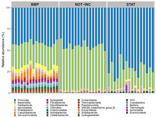 For static in vitro CH4 measurements (75 days), the same equipment was used as in the BMP assay under a temperature of 25 °C without using inoculum, mixing, or NaHCO3. Deionized water was added to each fecal sample with the ratio of excreted urine and feces from each cow. From the biogas, CO2 was fixed with a 3 M sodium hydroxide solution, and the volume of CH4 was determined via water displacement. Fecal samples for microbial community analysis were collected at the end of in vitro BMP and static CH4 measurement trials. Samples were placed into 5 mL tubes, snap-frozen in dry ice, and kept at −80 °C until RNA extraction.