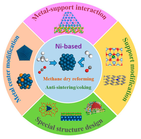 Many strategies, such as structural and electronic engineering, are employed to adjust the properties of the catalysts. For the control of carbon deposition on Ni-based DRM catalysts, the design includes the following aspects.