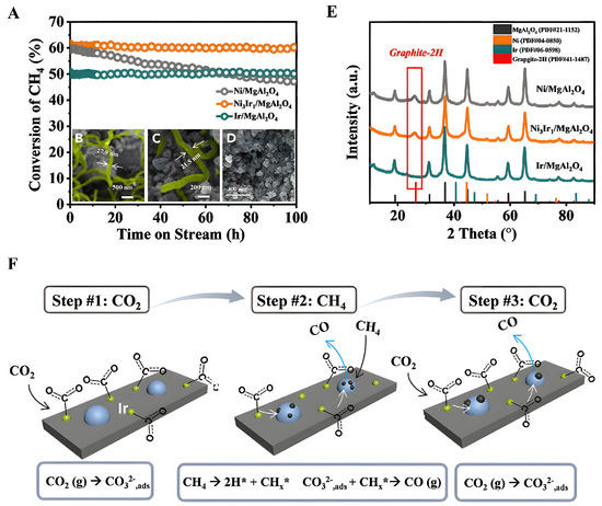 Catalytic performances of Ni-Ir catalysts in DRM and the characterization of spent catalysts [39]. (A) CH4 conversion on Ni/MgAl2O4, Ni3Ir1/MgAl2O4, and Ir/MgAl2O4 (reaction conditions for the catalytic test: 650 °C, CH4/CO2 = 1/1, GHSV = 40,000 mL g−1 h−1, and 1 bar). SEM images of (B) Ni/MgAl2O4, (C) Ni3Ir1/MgAl2O4, (D) Ir/MgAl2O4, (E) XRD patterns of the spent catalysts. (F) The schematic diagram of the mechanism to activate CO2 with the assistance of carbonate [39]. Reprinted with permission from Elsevier, copyright 2022.