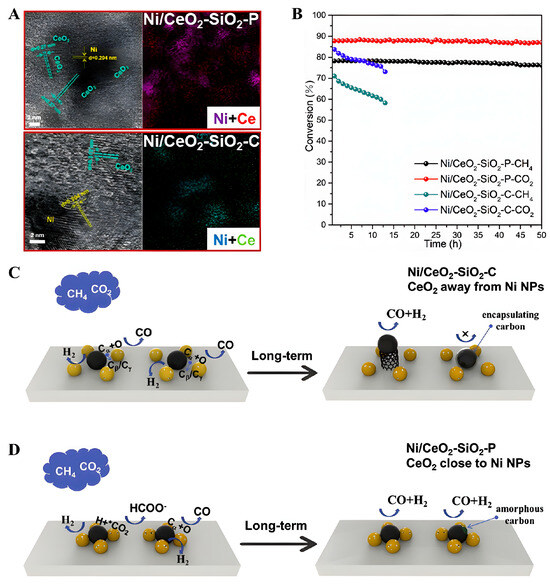 (A) TEM images of Ni/CeO2-SiO2-C and Ni/CeO2-SiO2-P. (B) Stability test at 700 °C [52]. (C,D) Illustration of the reaction pathways of DRM. Reprinted with permission from Elsevier, copyright 2019.