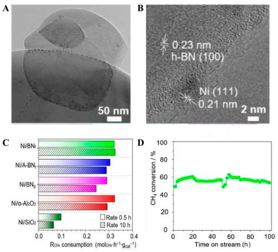 - Deng, J.; Gao, M.; Hasegawa, J.; Zhang, X.; Wang, A.; Chen, A.; Zhang, D. Unravelling the Anomalous Coking Resistance over Boron Nitride-Supported Ni Catalysts for Dry Reforming of Methane. CCS Chem. 2023, 5, 2111–2124. [Google Scholar] [CrossRef]