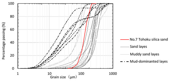 Artificial cores/models were created through water pluviation, dropping No. 7 Tohoku silica sand (d50 = 128 μm) into formation waters. No. 7 Tohoku silica sand was also used in our previous experiments since its grain size distribution is close to that of the MH reservoir in Nankai trough, Japan [14] (Figure 3). In addition, two types of formation water were used: (1) pure water (salinity 0%) and (2) a 5% NaCl solution, depending on the experiment conditions. Pure water was used to generate gas hydrate (Section 2.1.2), while the 5% NaCl solution was used for non-hydrated cores/models due to its effectiveness in preventing freezing. Initially, the initial salinity of the formation water had confirmed no damage or expansion to the effectiveness of grouting, since it would be replaced by the chemical injection [11].
