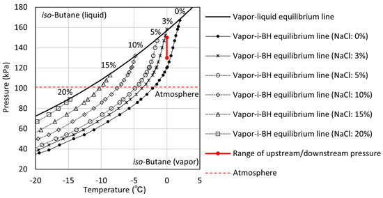 Equilibriums of iso-butane and i-BH with different inhibitor (NaCl) concentrations [12,16,17,18]. Reprinted/adapted with permission from Ref. [12]. 2023, The Japanese Association for Petroleum Technology.