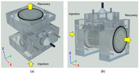 However, most of the above research was conducted as quantitative experiments using vertical cylindrical core cells, creating artificial cores through water pluviation from the top, injecting inhibitors and grout materials from the bottom, and recovering generated gas and permeated chemicals from the top, which were cured vertically and their physical properties were measured in the vertical (Z-axis) direction. It was significantly different from real reservoir conditions, which are usually considered to have horizontal or radial fluid flow. In the case of horizontal flow, grouted reservoirs were assumed to be much more heterogeneous than vertical cores, since chemicals would concentrate in limited portions due to the different densities between formation water, injected chemicals, and gas generated from MH dissociation. Additionally, the particles of grout materials in low-speed flow would sediment onto the upper surface of sand grains before their hydration (consolidation) [13]. This was assumed to lead to anisotropy in the grouted/cured reservoir.