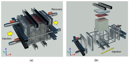 One-dimensional cubic models were an expansion of the one-dimensional cores, with dimensions of 70 mm in length, 50 mm in width, and 70 mm in height. They were also compact enough to be created homogeneously and injected horizontally, but could be measured in three dimensions. Parts were assembled easily and reliably by using a liquid gasket, which was inspired by the assembly of vehicle engines. Sand was dropped from the top of the model, and a piece of 70 mm × 50 mm rubber sealing strip was used to prevent fluid leakage through the top of the sand. Since cubic molds do not have the same rigidity as cylinders (1D core cells), steel outside frames were installed to prevent expansion and deformation (Figure 6). Additionally, the physical properties could be measured by cutting the models into 50 mm cubic samples, or drilling cores in the X, Y, and Z directions.