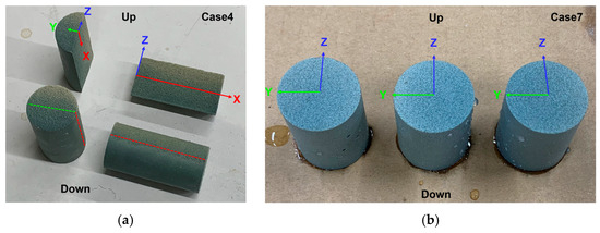 On the other hand, cases 4–6 involved horizontally injected cores under the same conditions (except fir direction), but all of them failed to be measured due to significant heterogeneities (Figure 10). In these cases, the grout material mainly passed through the lower parts of the cores, making them extremely hard, while the upper parts remained soft and required careful handling. The boundary of the well/poor-grouted portions was visible slightly above the position of the injection tube, suggesting that differences in densities between chemicals and formation water/gas caused significant heterogeneity in the distribution of chemicals and physical properties.