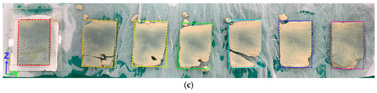 A 2D cross-sectional model was created for clarifying the heterogeneities of the porous grout body, described by the distributions of physical properties in each block. The basic configuration and mechanism were similar to our first 2D cross-sectional model created in 2018 [11] but with a greater thickness so that the physical properties in the Y direction could be easily measured. A rubber sealing strip was installed between the top of the sand layer and the bottom of the cap to prevent fluid leakage, similar to the 1D cubic models. Steel frames were installed on both sides of the model to withstand the pressure of iso-butane, with lifting rings so that the model could be moved by a mini crane. Unlike the 1D cores or models, the 2D cross-sectional model could be cut into several blocks to clarify the distributions of the physical properties (Figure 7).