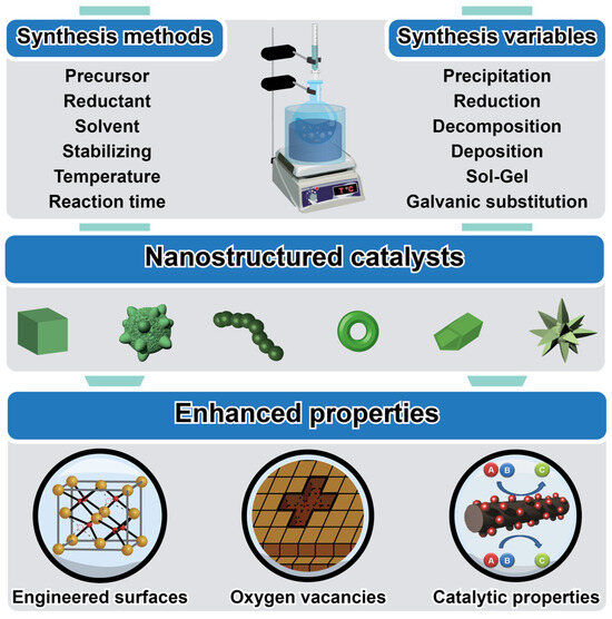 Schematic illustration outlining the fundamentals of controlled nanocatalysts, elucidating the main synthesis methods and their variables, as well as the improved properties.