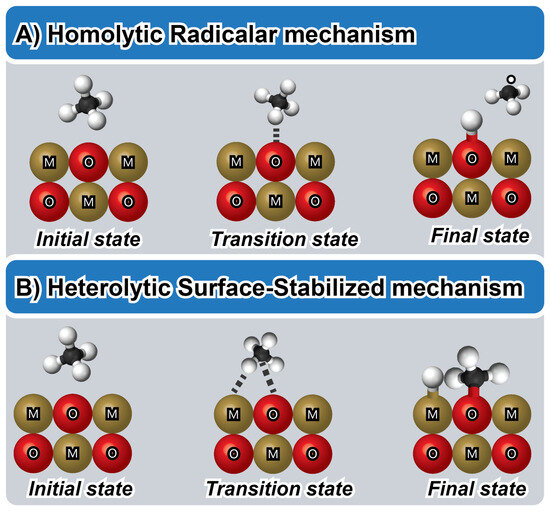 In Figure 3, methane activation is depicted as being dependent on the interaction between methane and the surface, occurring through either a radical or surface-stabilizer pathway. The methane conversion process involves the initial breaking of the C-H bond [30]. In Figure 3A, a homolytic radical mechanism is illustrated. This mechanism proceeds through hydrogen abstraction via active oxygen species in the M-O active site, resulting in the formation of a hydrogen atom adsorbed on the catalyst surface (M-OH) and a free methyl radical (*CH3) with sp2 hybridization and a trigonal planar geometry [30,34,35]. The *CH3 radical does not form M-C bonds with active sites, and the *H exhibits a weak interaction forming OH groups. Additionally, a one-electron redox process occurs, leading to the oxidation of the carbon center from the −4 state to the −3 state and the corresponding reduction of the active sites [29,30]. This process requires strong oxidants, such as H2O2 and N2O, and high metal oxidation states to form electron-deficient species, such as O− and O2−, thereby promoting the homolytic dissociation of C-H bonds [5,29,30,34,36]. The enhanced properties, such as oxygen vacancies, promoted in MgO, CeO2, TiO2, and TbOx contribute to a stronger ability to activate methane due to the easily reducible surface [29,30].