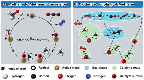 Schematic illustration of the catalytic reaction mechanism of the methane-to-methanol conversion (A) and oxidative coupling of methane (B). The scheme (A) is reproduced with permission from [100], American Chemical Society Publications, 2021. The scheme (B) is reproduced with permission from [47], Elsevier, 2018.