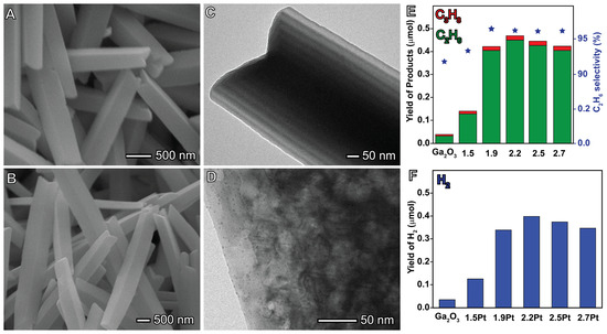 In a well-controlled synthesis example, Ga2O3 microrods were combined with Pt nanoparticles with particle sizes ranging from 1.5 to 2.7 nm for the photocatalytic coupling of methane. The Ga2O3 microrods were synthesized via a template-free solvothermal method using ethanol/water as the solvent. This process resulted in the formation of microprisms of CaOOH, which were then annealed to produce mesoporous microrods, which measured 4–5 μm in length and 200–300 nm in width (Figure 10A,B). Pt nanoparticles were subsequently photodeposited onto the surface of the Ga2O3 microrods to achieve well-controlled sizes of 1.5, 1.9, 2.2, 2.5, and 2.7 nm, resulting in highly dispersed Pt nanoparticle distribution (Figure 10C,D). The particle size of the Pt nanoparticles extended the absorption range into the visible-light region and increased the band gap of the composite material [118].