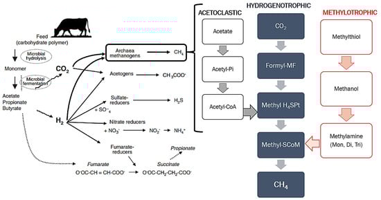 Carbon dioxide (CO2) is a byproduct of CHS fermentation by ruminal microbes [,,]. This molecule is linked to H+ or formate to synthesize CH4, an important metabolic reaction performed by hydrogenotroph archaea (Methanobacterium, Methanomicrobium and Methanobrevibacter spp.) []. Besides these main species, methylotrophs (Methanosphaera spp.) are able to utilize methyl compounds to synthesize CH4, while acetoclastic organisms (Methanosphaera spp.) are able to uptake acetate to do so [,]. The metabolic process of CH4 synthesis is rate-limited by methyl coenzyme M reductase (MCMR), which mediates the final step of the methanogenesis pathway [,,,] as shown in Figure 1.