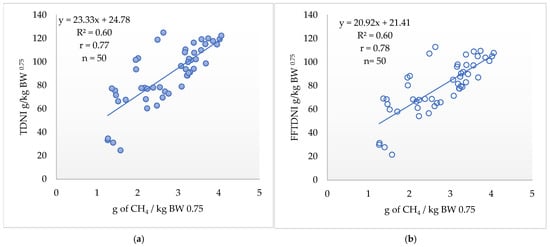 (a). Linear regression between in vivo CH4 emission and the predictor (TDN intake) for MPS (Equation 6-1, NASEM, 2016). (b). Linear regression between in vivo CH4 emission and the predictor (FFTDNI—fat free TDN intake) for MPS (Equation 6-2, NASEM, 2016) []. Each datapoint corresponded to the average of each treatment in each study.