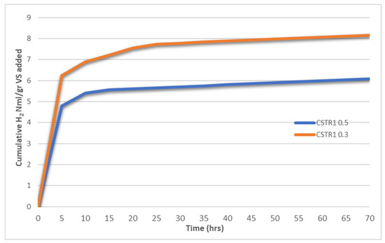 Examining the biohydrogen production in more detail and correlating it with the volatile solid concentration (Figure 1) in the waste fed to the two reactors (CSTR1), it is observed that the degradation of the solids takes place mainly in the first hours of DF. After the end of the first day, the ratio of H2 production to VSadded was calculated at 7.7 NmL/g VSadded for an ISR equal to 0.3 and 5.7 NmL/g VSadded for an ISR of 0.5, followed by a slight increase (until the end of the process), resulting in values of 8.2 NmL/g VSadded and 6.1 NmL/g VSadded for ISRs of 0.3 and 0.5, respectively.