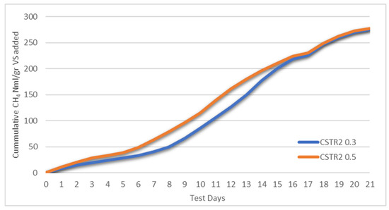 Figure 2 shows the biomethane production per VSadded. As expected, the variation in values is similar to biomethane production, resulting in a final value of 275.17 NmL/g VSadded and 277.47 NmL/g VSadded for CSTR2 0.3 and CSTR2 0.5, respectively.