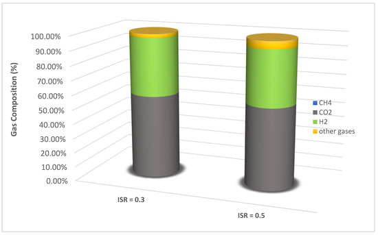 Figure 3 illustrates the composition of the biogas produced during the dark fermentation process for the two different values of ISR. The biohydrogen content is at the same level for both ISRs: 40.3% for 0.3 and 38.3% for 0.5, respectively. The highest percentage of biogas content is carbon dioxide: 57.2% and 56.4% for ISRs of 0.3 and 0.5, respectively. Finally, other gases such as monoxide, hydrogen sulfide, nitrogen, etc. are present in lower proportions.