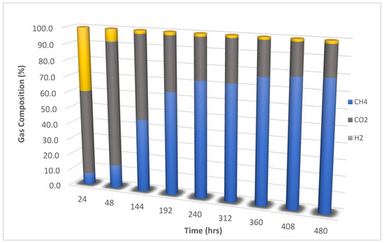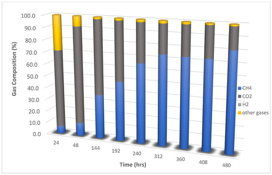 More specifically, Figure 4 illustrates the composition of the biogas produced in the CSTR2 reactor, which was fed by CSTR1 with an ISR equal to 0.3 at different times. As initially observed, the biogas produced is mainly composed of CO2 (approximately 65%), while as the process progresses, the digestion of the organic waste leads to a higher yield of the desired gas (biomethane), stabilizing the percentage above 80%. The end of the experimental process leads to the production of biogas with a content of 81.2% in biomethane, 17.6% in CO2, and only 1.2% in other gases.