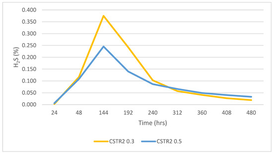 According to [6], the sulfur content (%) in FW ranges from 0.09% to 0.7%. Due to its presence, it is crucial to quantify the H2S percentage generated during anaerobic processes. Hydrogen sulfide is toxic, and its presence in a combined heat and power (CHP) combustion engine results in the formation of SO2 and SO3 oxides, which are highly corrosive to pipelines, instruments, equipment, and metal surfaces [27]. Figure 6 illustrates the H2S composition (%) for the two anaerobic processes. As observed, the H2S content decreased during the DF procedure. In the AD process, the H2S on the 1st day was low; an increase was observed during the digestion until the 6th day, reaching 0.375% for CSTR2 0.3 and 0.246% for CSTR2 0.5. After the 6th day, the H2S content increased until the end of the process, with values of 0.02% and 0.03% for CSTR2 0.3 and CSTR2 0.5, respectively. The highest H2S content was produced during the first days of the AD process. The H2S peak (6th day) does not coincide with the methane production peak (10th day, as shown in Figure 4 and Figure 5), as the low pH and high CO2 generation at the starting phase of the digestion led to significant H2S release [28].