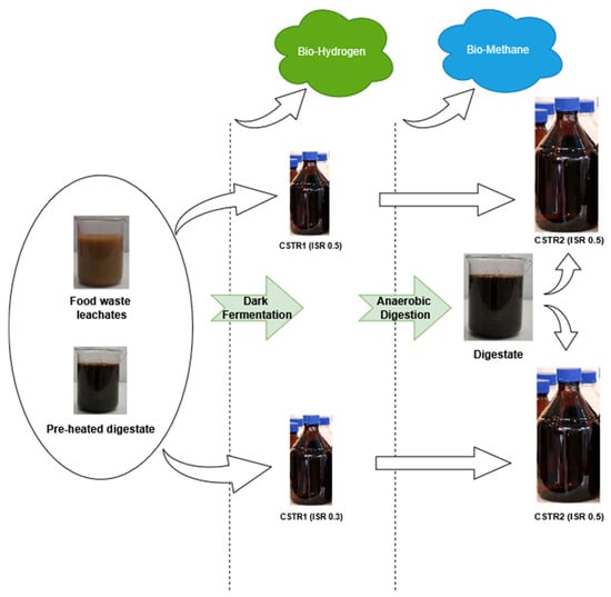 Regarding the DF procedure, two CSTR bench-scale bioreactors (CSTR1) with a nominal volume of 1 L and a working volume of 0.75 L were used. ISRs of 0.3 and 0.5 were studied to determine the biohydrogen production yield. Similarly, two CSTRs (CSTR2) with nominal volume and working volumes of 2.5 L and 1.7 L, respectively, were used for the AD process. Τhe CSTR2 bioreactors were inoculated with non-pretreated AS and the contents of the two CSTR1 bioreactors after the completion of the DF procedure. The ISR for biomethane production was 0.5 g VS AS/g VS effluent of the DF process [20,30]. Figure 7 illustrates the experimental pattern, while Figure 8 represents the flow diagram of the process.