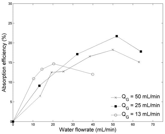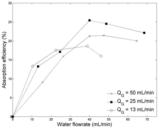 In configuration 1, the absorption efficiency was measured for various gas and liquid flowrates (Figure 1). For each gas flowrate, the absorption efficiency shows a maximum at different liquid flowrates. At the lowest investigated gas flowrate, the maximum is around QL = 20 mL/min. It is noteworthy that under these operating conditions, precise measurements are tough to achieve as the gas coming out of the reactor is likely to be diluted into the gas initially present in the separator. For gas flowrates of 25 and 50 mL/min, the maximum is obtained for QL = 50 mL/min. A relative experimental error of 3% applies to the entire data set in this work.