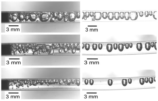 Images of the gas–liquid dispersion at the outlet of the micromixer (left) and at the end of the tube (right), for QG = 50 mL/min and QL = 20 mL/min (top), QL = 40 mL/min (middle) and QL = 60 mL/min (bottom).