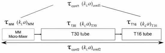 The kLa values determined are global and include the performance of the whole system: the micromixer (MM), the gas–liquid separator and the link between these two elements. In configuration 1, this link is a tube (16 cm long and 3 mm of internal diameter), which is referred to as T16. In configuration 2, the link is composed of the same T16 tube plus the 30 cm long observation tube (T30). As explained in Section 3.2, the absorption in the separator can be neglected. The contribution is measured in terms of (kLa)conf1 and (kLa)conf2 according to the scheme shown in Figure 6. The space times τ were calculated as the ratio of the volume of the element to the total volumetric flowrate, and the various contributions are linked [] according to the following equations: