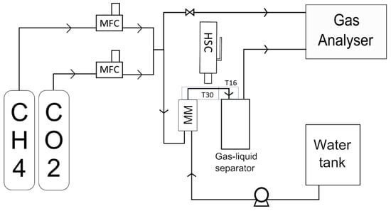 Figure 7 shows a schematic representation of the experimental set-up. It comprised two feed sections, a micromixer and an analysis section. The first feed section was designed to mix pure methane and carbon dioxide (from two grade-3.5 gas bottles) of desired composition by means of two mass flow regulators SLA5850 (Brooks, Greenville, PA, USA). The second feed section was used to supply the liquid with a gear pump. The used liquid was de-ionized water. The liquid flow rate was measured by weighting the mass in the tank between the beginning and the end of the experiment. The outlet stream was fed to a closed glass cylinder, which served as a gas–liquid separator. The outlet gas composition was evaluated by a Micro GC 490 micro gas chromatograph equipped with a COX column and a TCD detector (Agilent, Les Ulis, France). A by-pass could be used to lead the initial gas mixture directly to the analyzer and check the composition of the inlet gas mixture.