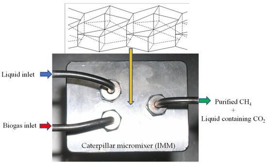 The gas–liquid flow patterns in microchannels differ from those observed in larger channels because of the importance of wall effects and surface phenomena, which means that common flow pattern maps generally do not apply. To check this point, Wang et al. [] investigated the pressure drop and the mass transfer performance in gas–liquid flows through microchannels with different surface wettability. The results show that kLa was generally higher in hydrophobic microchannels than in hydrophilic ones. Finally, Ganapathy et al. [] carried out the absorption of CO2 into aqueous diethanolamine in microchannels with hydraulic diameters ranging from 254 to 762 µm. They proved that both the absorption efficiency and the volumetric mass transfer coefficient kLa increase with the decrease in the channel diameter. Since Reynolds numbers are usually low in microstructured reactors, flows are generally in the laminar regime. Therefore, mixing is mainly achieved by molecular diffusion. In order to improve the mixing efficiency, several types of micromixers have been proposed: interdigital micromixers [], split-and-recombine micromixers [] or chaotic micromixers []. These so-called static mixers already have numerous applications at the macro scale in process industries [], including CO2 scrubbing. As gas–liquid reactors, they offer many advantages such as high mixing efficiencies, great interfacial area or plug-flow behavior. The micromixer used in the present work was previously described in the literature for the mixing of liquids [] or organic synthesis []. The objective of this study is the characterization of the gas–liquid mass transfer performance of a micromixer in view of upgrading biogas to bio-methane.