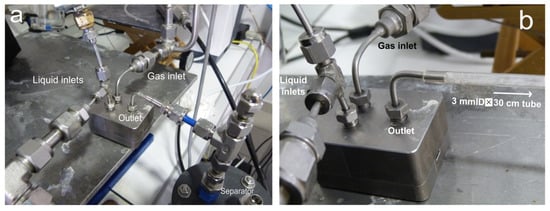 In configuration 1 (Figure 9a), the gas–liquid mixture exited the micromixer directly into the gas–liquid separator. The total volume of the gas–liquid contact zone (the micromixer and a connection tube of 3 mm I.D. and 16 cm long) was 1.21 × 10−6 m3. In configuration 2 (Figure 9b), a transparent plastic tube was added at the outlet of the micromixer. This tube allowed the observation of gas–liquid dispersion as well as a more precise quantification of the mass transfer, as discussed in Section 2.2. All other elements were kept identical with respect to configuration 1. The total volume of the gas–liquid contact zone in this configuration was 3.25 × 10−6 m3.