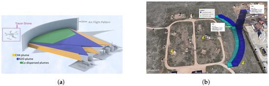 (a) Modeled plume from a facility with tracer release and tracer drone deployed to take concentration measurements where there is co-dispersion, using an arc flight pattern to match the plume’s lateral dispersion. (b) Concentration overlay of CH4 and N2O using the arc sampling method at the METEC facility. The height of the N2O and CH4 bars show the concentration of the gases.