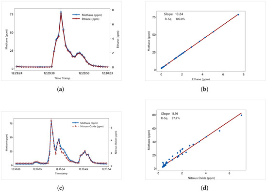 (a) Time series plot of the downwind concentration of CH4 and C2H6. (b) Linear regression plot of CH4 and C2H6, showing the value and the slope value. The value is 1 because both CH4 and C2H6 are co-emitted from the whole gas release of natural gas. (c) Time series plot of the downwind concentration of CH4 and N2O. (d) Linear regression plot of CH4 and N2O, showing the value and the slope value.