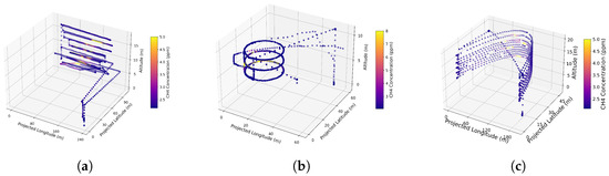 Different flight patterns used and the optimizations made. (a) Curtain flight pattern. (b) Cylindrical flight pattern. (c) Arc flight pattern. Based on our hypothesis, the cylindrical flight pattern addresses the lateral dispersion of plumes, while the arc flight pattern is introduced to extend battery life, enabling more measurement data collection.