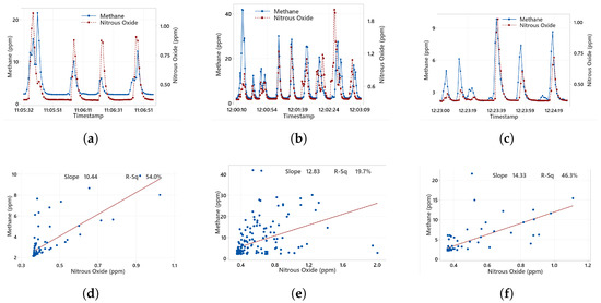 In an alternative approach to evaluating tracer-based emission estimates, data from multiple individual plumes were concatenated and treated as a single composite dataset per flight pattern. This method was applied exclusively to sUAS-based experiments under both curtain and arc sampling configurations. Instead of analyzing each plume separately, this approach assumes the aggregated transects collectively represent a single, more robust measurement of the downwind signal. The curtain flight pattern produced notably lower relative errors and uncertainties for most estimation methods when compared to the arc. The slope method yielded a relative error of with an uncertainty of , while the cumulative sum and integrated area methods produced identical relative errors of and uncertainties of . The peak value method, while delivering the lowest relative error , exhibited the highest uncertainty at . For the arc configuration, the cumulative sum and integrated area again yielded consistent results (relative error: ; uncertainty: ), but the slope method was more biased () and uncertainty (). Interestingly, the peak value method provided the best relative accuracy among arc estimates (), but with the highest associated uncertainty (), consistent with its volatility across trials. The effect of increased vertical sampling range was evident in the arc flights. Extending the flight ceiling from 12 m to 20 m significantly improved the slope method’s performance, reducing the relative error from to , and the uncertainty from 66.71 to . The peak method also experienced a decrease in uncertainty (from 78 to ), albeit with a slightly worsened relative error (). The cumulative sum and integrated area methods showed only slight changes in bias but benefited substantially in uncertainty, which dropped from to just . These results suggest that enhanced vertical coverage allows for better resolution of the plume’s spatial distribution, stabilizing the estimation metrics, especially for integration-based methods. These results are further illustrated in Figure 5, which shows time series data (Figure 5a–c) for CH4 and tracer concentrations across the curtain and arc flight patterns, as well as the corresponding regression fits (Figure 5d–f). The curtain configuration, sampled at greater distances downwind, produced a more linear CH4–tracer relationship (Figure 5d), as indicated by a higher value. In contrast, the arc pattern at 9–20 m altitude (Figure 5e) exhibited weaker correlation, likely due to limited plume co-dispersion at the downwind sampling location, while the arc flight at 9–12 m (Figure 5f) demonstrated improved linearity but resulted in higher uncertainty.