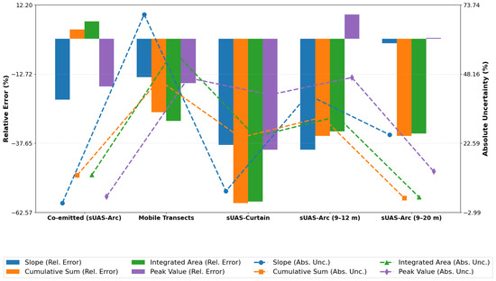 Relative errors and absolute uncertainties for CH4 emission quantification across five measurement scenarios using four analytical methods. Bar plots represent relative errors (%), while dashed lines with markers indicate absolute uncertainties (%). Each method is color-coded and compared across scenarios including co-emitted tracer, mobile transects, and various sUAS-based configurations.