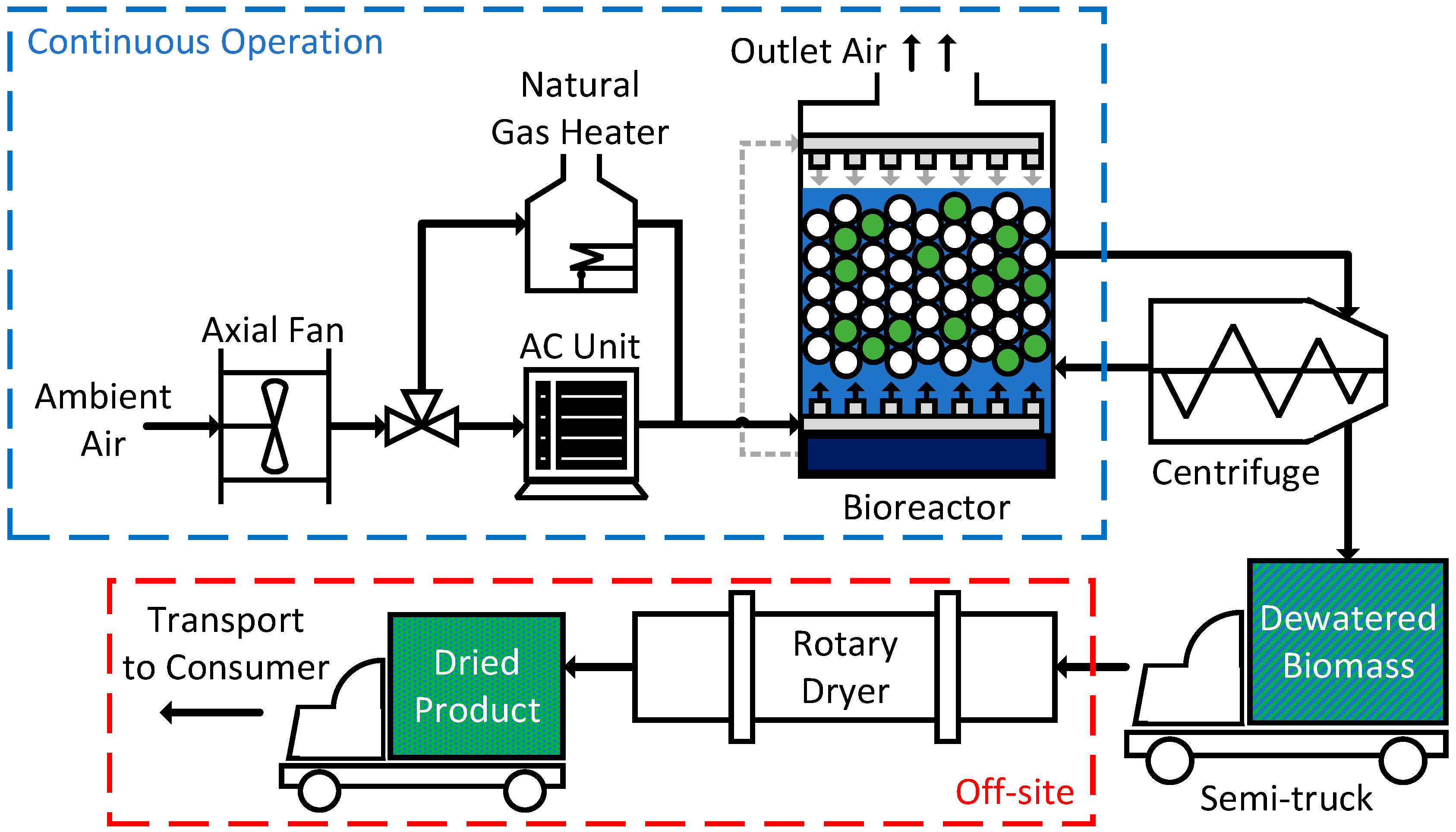 10]. It is necessary to leave some of the biofilm present so that the reactor may continue to operate and regrow for the next harvest, so it is not necessary nor desirable to try to harvest 100% of the biomass. The dewatered biomass is then transported via semi-truck to a central location where multiple reactors’ harvests can be processed via a drum dryer. The dryer achieves product concentrations of approximately 85% solid biomass, which is then transported to be sold as the final product of the process.