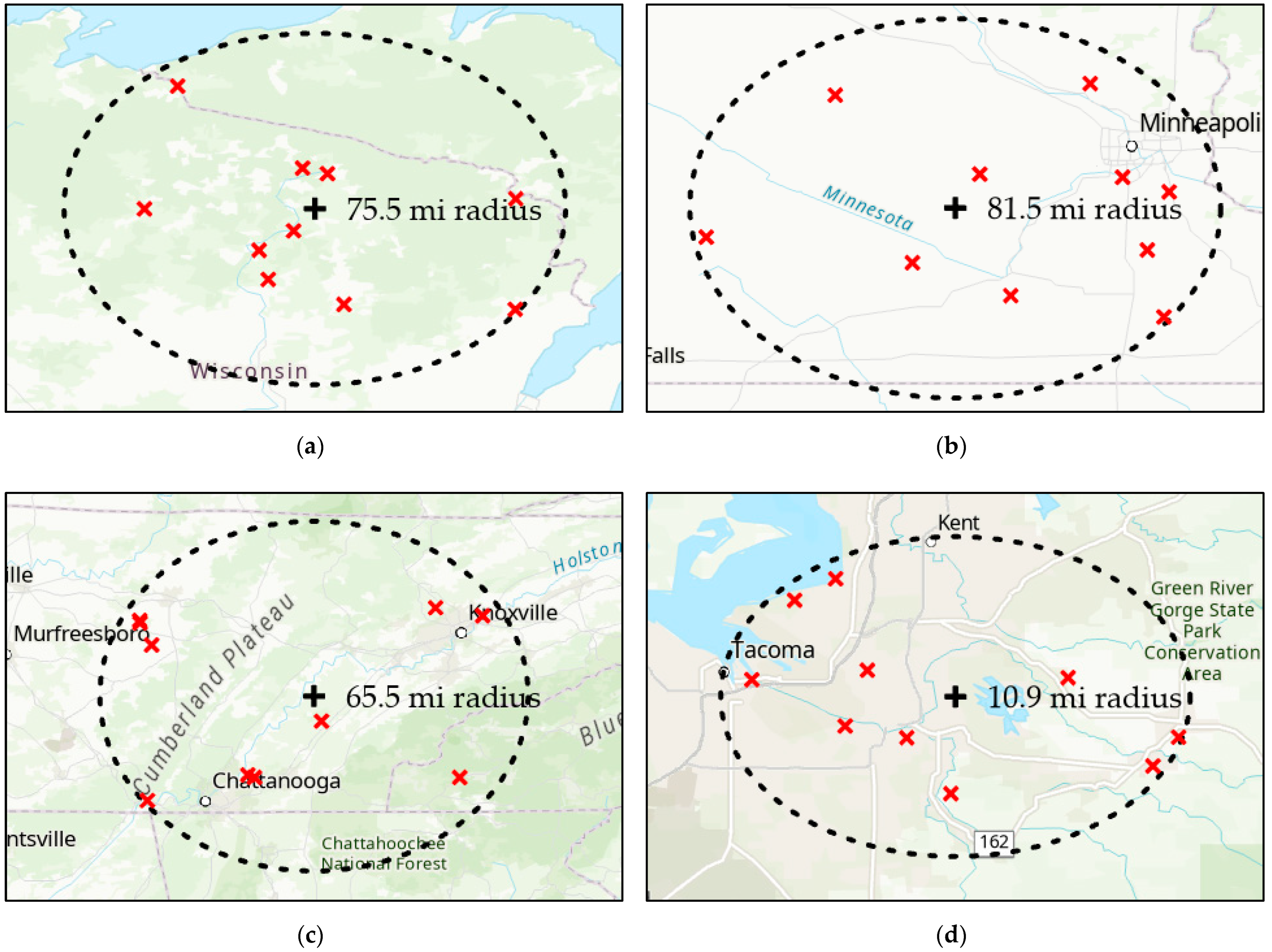 Figure 2 are four examples of regions across the U.S. near our scenario locations where a combination of landfills and dairy feedlots are present, demonstrating the viability of this 100-mile radius assumption. As of 2021, a combined total of 13,000 inactive and active landfills were present in the U.S. [