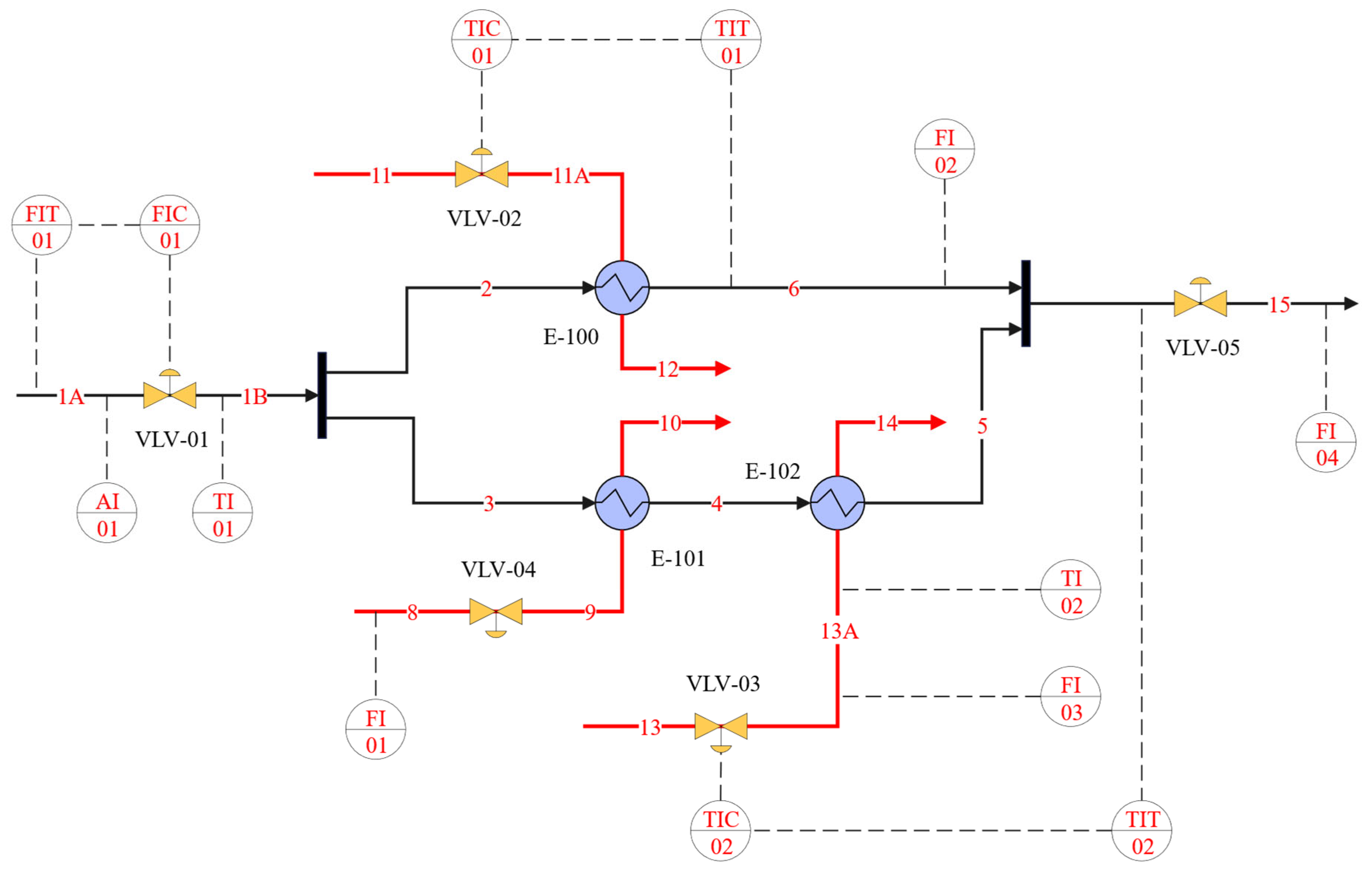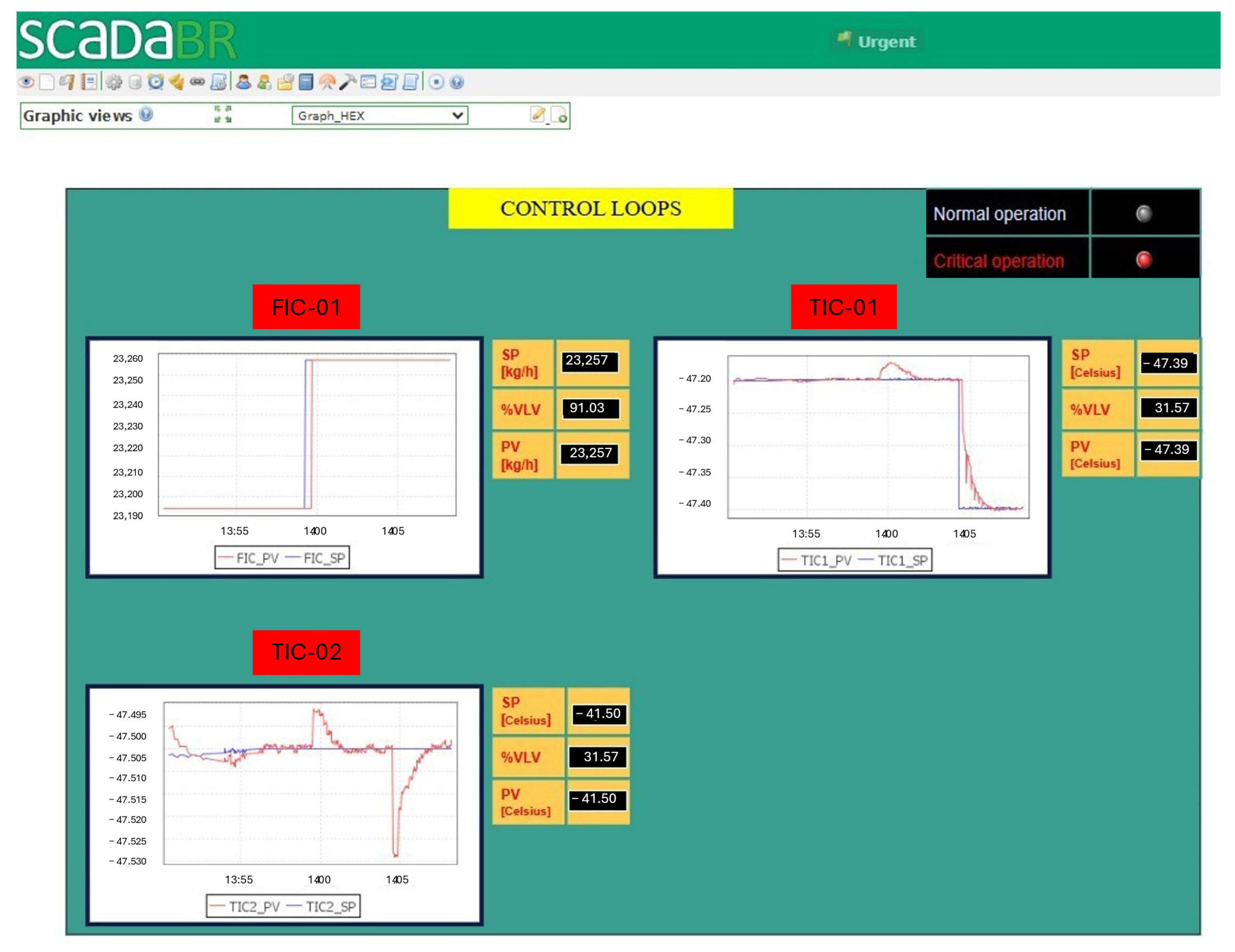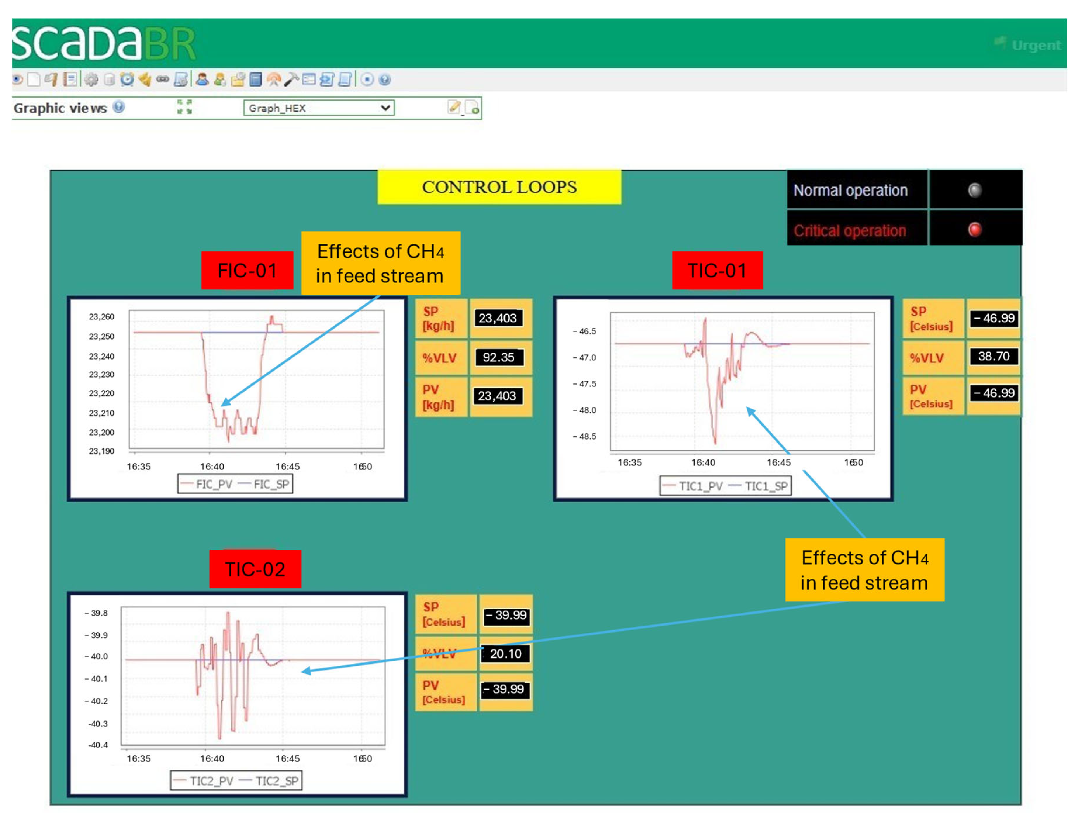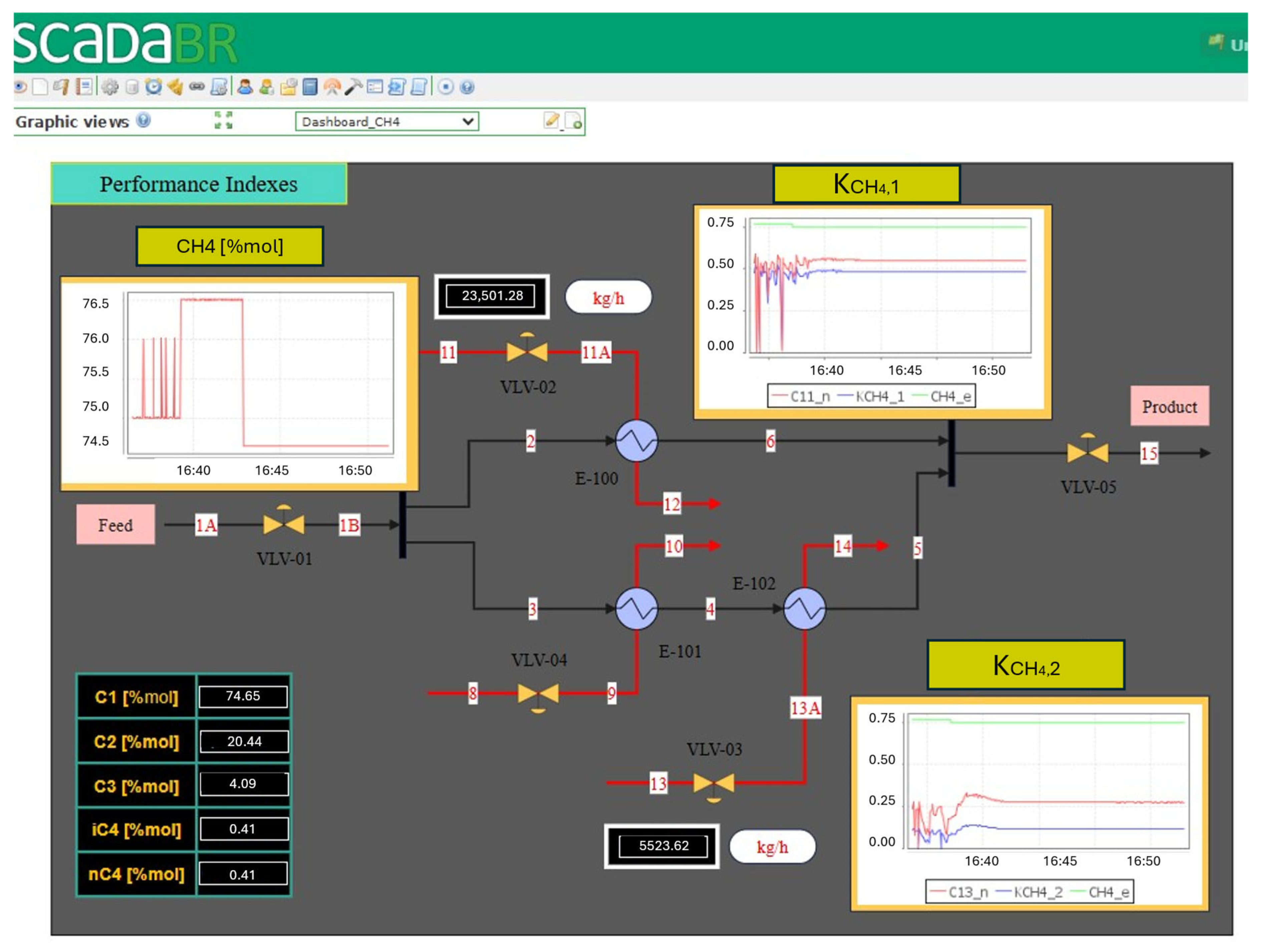 Figure 11 presents the Human–Machine Interface (HMI) of the ScadaBR system used to monitor and control the continuous process under study. The interface provides a high-level plant overview, integrating process equipment, instrumentation, control loops, and operational status indicators within a single supervisory environment. The process is represented by a diagram illustrating the material flow from the feed stream to the product outlet. Pipelines interconnect process units, and the flow direction is explicitly indicated. Real-time measurements of key process variables are displayed numerically, enabling continuous monitoring of plant performance. Temperature and flow variables are measured using temperature transmitters (TT) and flow transmitters (FT), respectively. Analytical measurements are provided by analyzer indicators (AI), which supply real-time information on process composition. This monitoring is supported by an online composition analysis panel, which reports the molar fractions of key components (C1, C2, C3, iC4, and nC4). Control actions are implemented via temperature and flow indicating controllers (TIC and FIC), each associated with a defined setpoint (SP). Several closed-loop control systems are implemented and visually identified by dashed connections between sensors, controllers, and final control elements. The control loops regulate critical process variables by manipulating control valves (VLV-01, VLV-02, VLV-03), with valve positions expressed as a percentage of the valve’s opening. In particular, the feed flow rate is regulated by a flow control loop (FIC-01), whereas the process thermal conditions are maintained by temperature control loops (TIC-01 and TIC-02). As the temperatures of streams 6 and 15 vary, the controllers TIC-01 and TIC-02 manipulate the flow rates of streams 11 and 13, respectively. The process also includes multiple heat exchangers (E-100, E-101, and E-102) that enable energy integration and temperature control across process streams. Operational status is communicated through visual indicators that differentiate normal and critical operating conditions. This alarm visualization strategy enhances situational awareness and supports timely operator intervention during process disturbances.