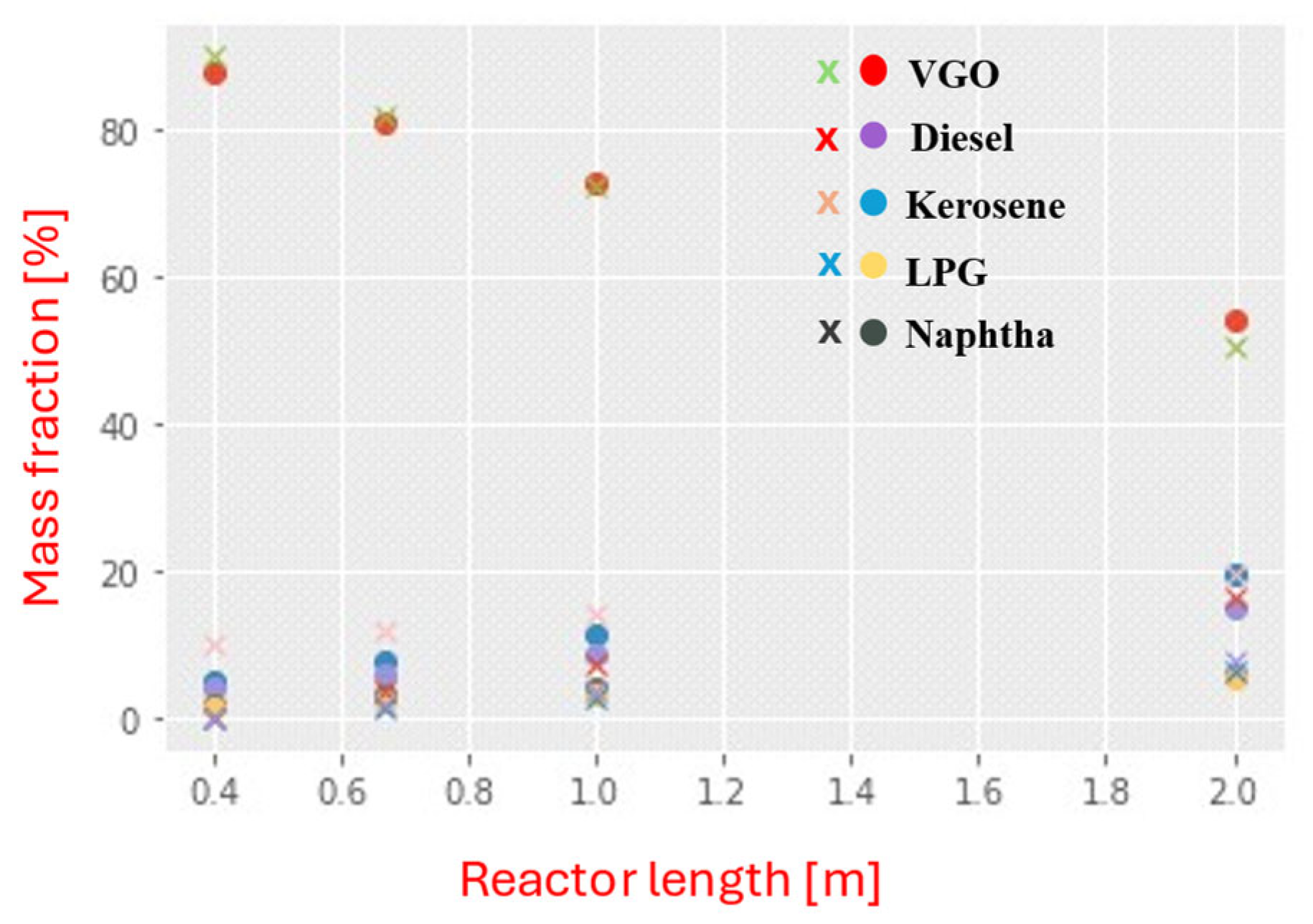 Figure 7 show typical mass–fraction profiles for VGO and its products at 410 °C and 390 °C, respectively. It indicates that the model reasonably reproduces the lower-temperature behavior. At 410 °C, the discrepancies are most pronounced at early times (0.4 h and 0.667 h) and diminish after approximately 1 h. This pattern suggests a small mismatch in the short-term dynamics. By contrast, at 390 °C, the slower kinetics reduce sensitivity to such transients, yielding closer agreement with the experiment over the whole-time horizon.